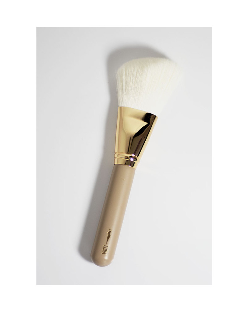 Każdy detal został dopracowany: drewniany trzonek w odcieniu nude, złota skuwka i białe włosie tworzą luksusową, minimalistyczną całość, która pięknie wygląda nie tylko na toaletce, ale i na zdjęciach.