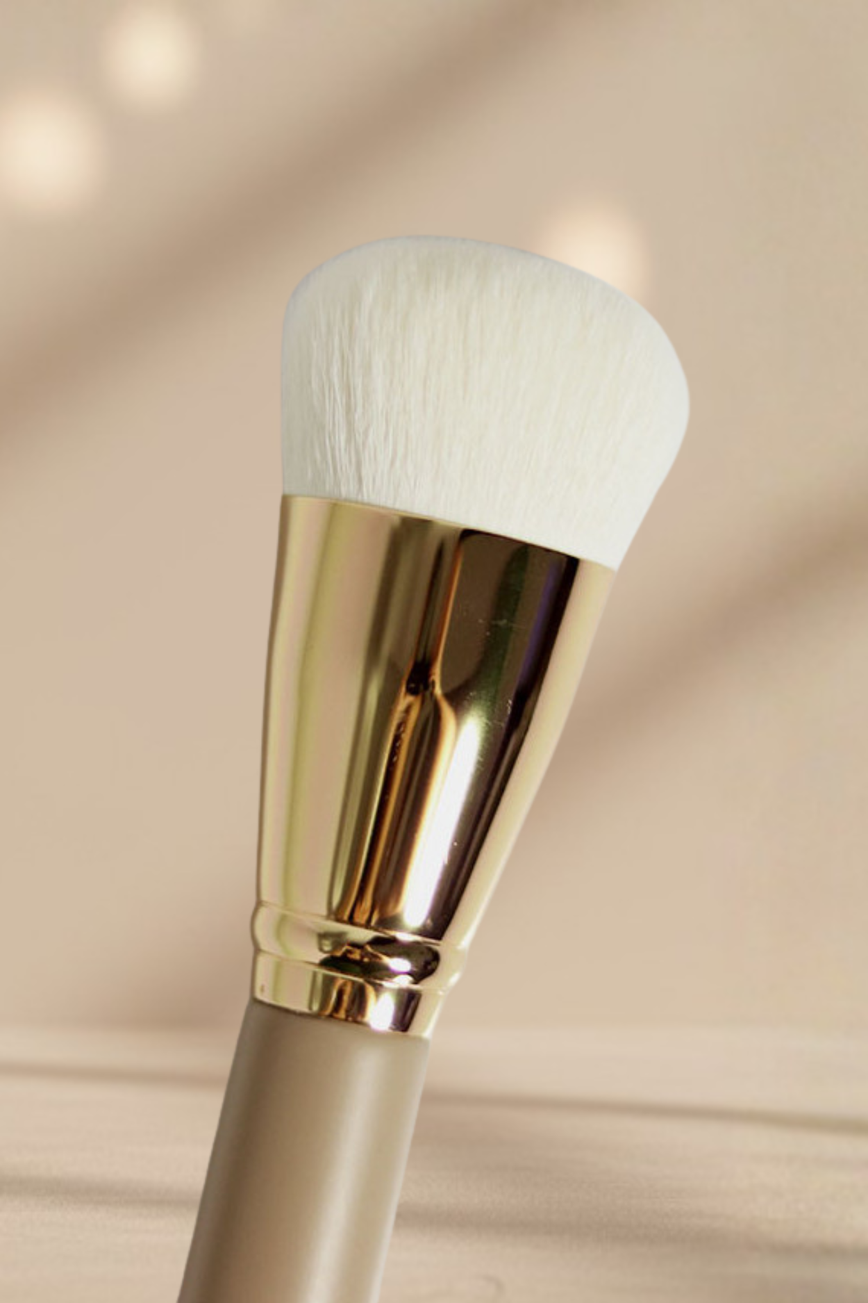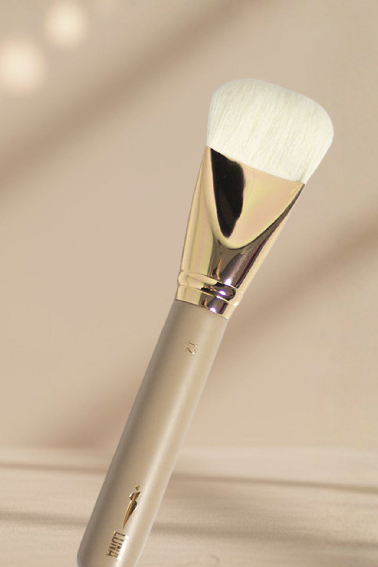 Całość wieńczy luksusowy design: drewniany trzonek w kolorze nude, elegancka złota skuwka i kontrastujące białe włosie – perfekcyjne połączenie minimalizmu i elegancji.